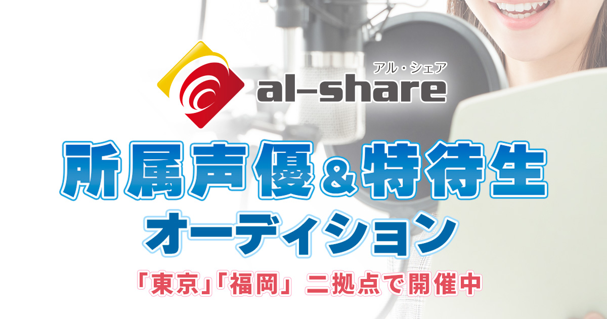 声優事務所 株式会社アル・シェア(本社:東京都新宿区高田馬場4-18-9 ハイシティ高田馬場410、代表取締役:藤田浩治、以下アル・シェア)は東京・福岡の二拠点で、所属声優オーディション及び附属養成所D-eXの特待生オーディションを同時開催します。
