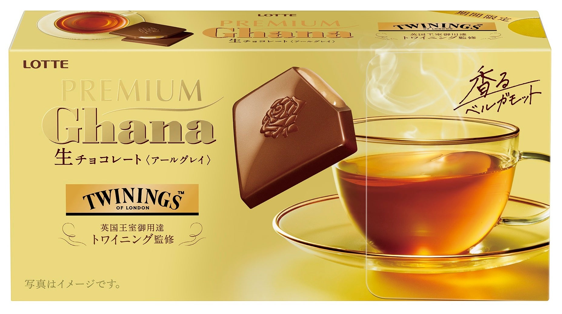 ロッテでは、1月17日(火)にトワイニング監修の新商品「プレミアムガーナ トワイニング監修生チョコレート<アール グレイ>」を発売します。渋みの穏やかな紅茶と爽やかなベルガモットが香る、トワイニングのアール グレイをイメージしたとろける口どけの生チョコです。ガーナミルクの薄いシェルの中に閉じ込めることで、すっととろける繊細な口どけを感じられる贅沢な一枚に仕上げました。今日一日を頑張ったご褒美に、贅沢なひとときを。