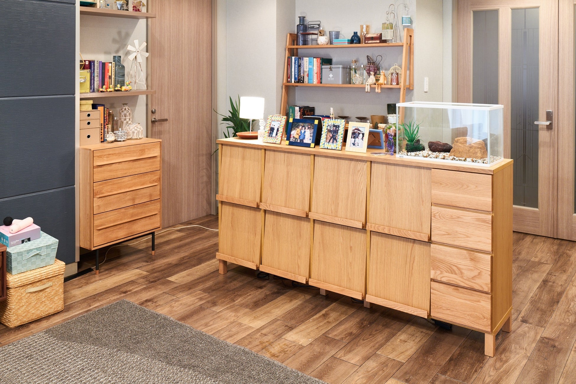 ヴィンテージを彷彿とさせる味のある風合いと、すっきりとシンプルなデザインが魅力のスタイリッシュなチェスト。あえて凹凸を付けるノコ目加工を施した前板が、天然無垢の質感をさりげなく引き立てます。