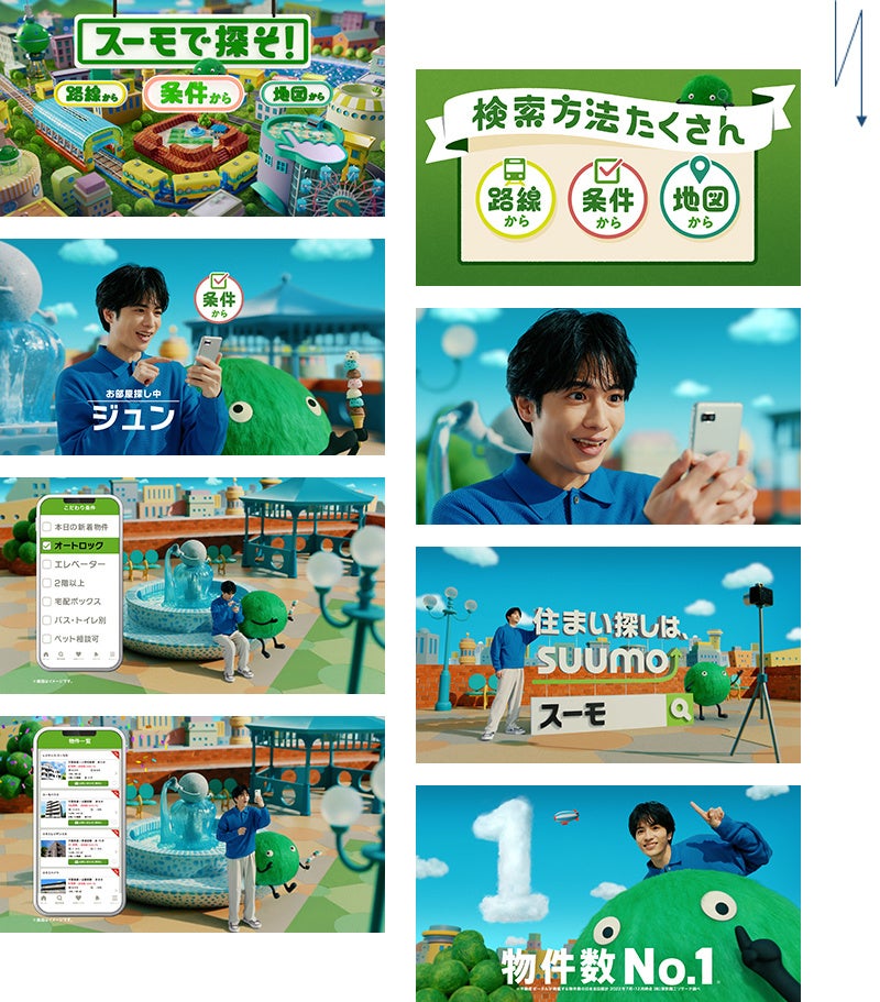 ポップな世界観の中で繰り広げられる「スーモで探そ!」シリーズの本作は、住まいの「条件」に焦点を当てています。公園の噴水の前に腰をかけ、物件探しをする志尊さん。「僕は、こだわり条件から!」と、オートロックや宅配ボックスの項目にチェックを入れて検索すると、すぐにたくさんの物件情報が表示されます。簡単にお気に入りの物件を探せることに、「探しやすい!」と感動する志尊さん。最後は希望の物件が見つかった喜びから、『SUUMO』のモニュメントの前でスーモと記念撮影します。