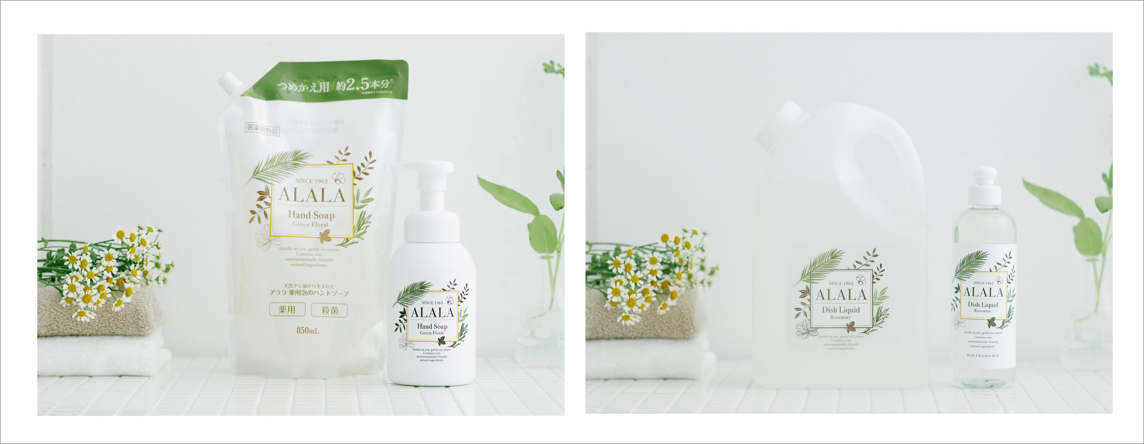 天然パームヤシ油由来の自然派洗剤。生分解性に優れ、環境や手肌にもやさしい使い心地。肌のうるおいを守るため、数種類のハーブエキスを贅沢に配合したALALAシリーズのハンドソープと台所用洗剤の詰め替えセット。