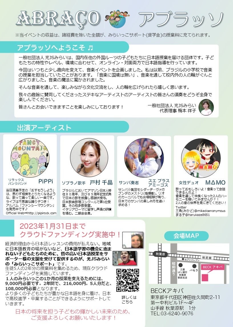 一般社団法人 光JSみらい(本部:東京都大田区、代表 梅本 祥子、URL:https://hikarijs-mirai.org/)は、外国につながりのある子どもたちの日本語学習を支援するためのチャリティーイベント『アブラッソ』を、3月4日㈯BECKアキバにて開催いたします。