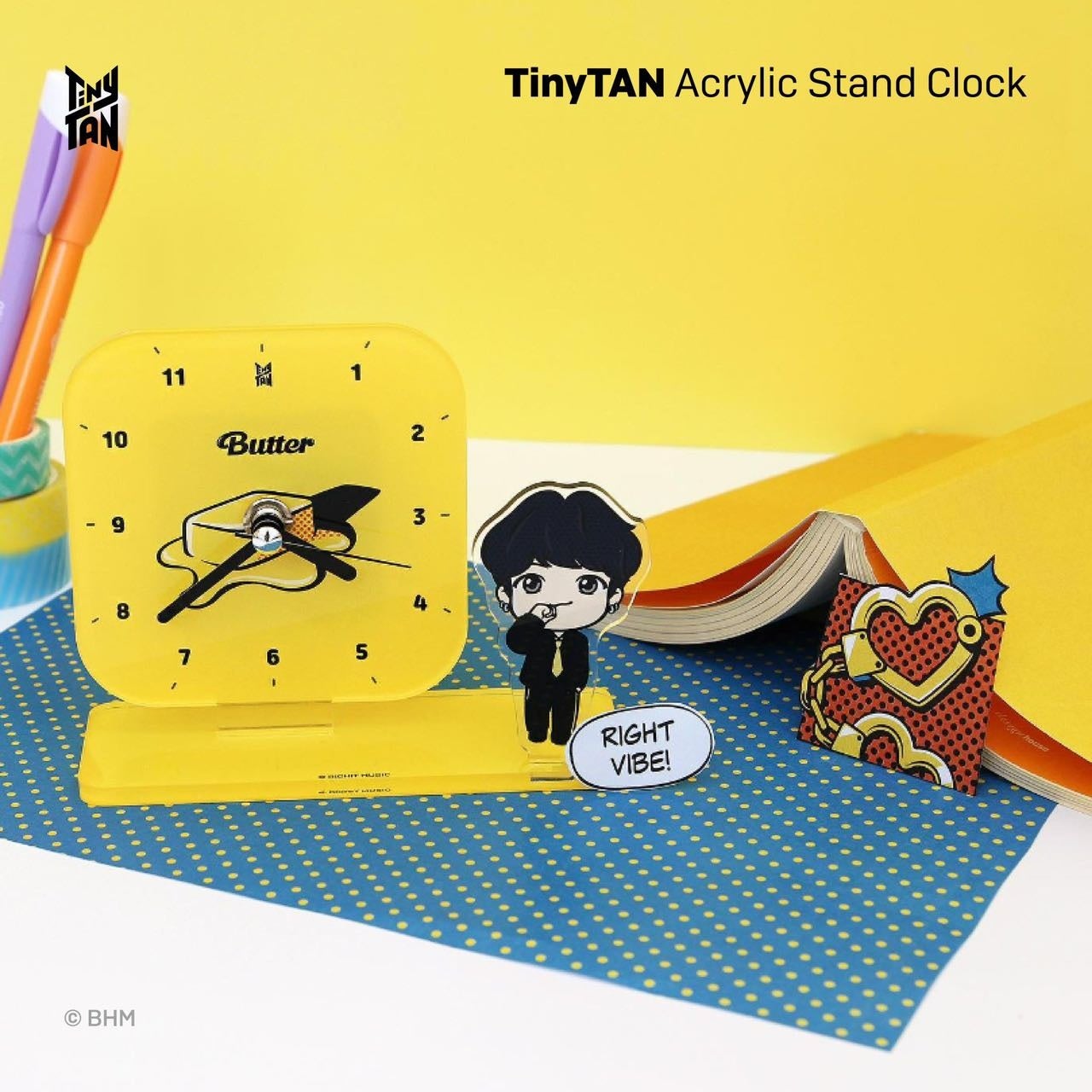 その他、光文社の写真集やACRYLIC STAND CLOCK(4,290円)、永久定番曲の「MICDrop」「DNA」「Dynamite」などの人気曲をモチーフにしたイヤーマフラー、バケットハット、手袋、マフラー、など冬のアイテムもご用意しております。