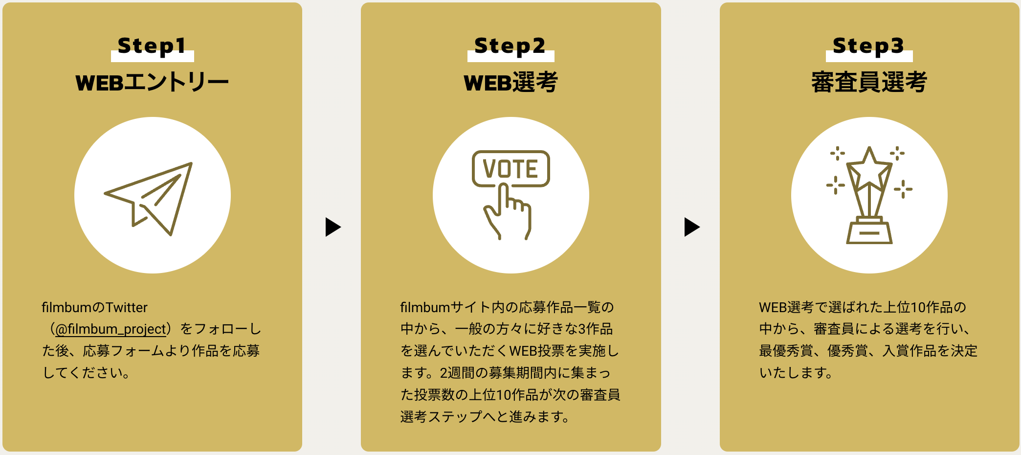 ・応募作品をfilmbumのサイトにて公開し、WEB投票を行います。ここで選ばれた上位10作品が審査員選考ステップへ進みます。