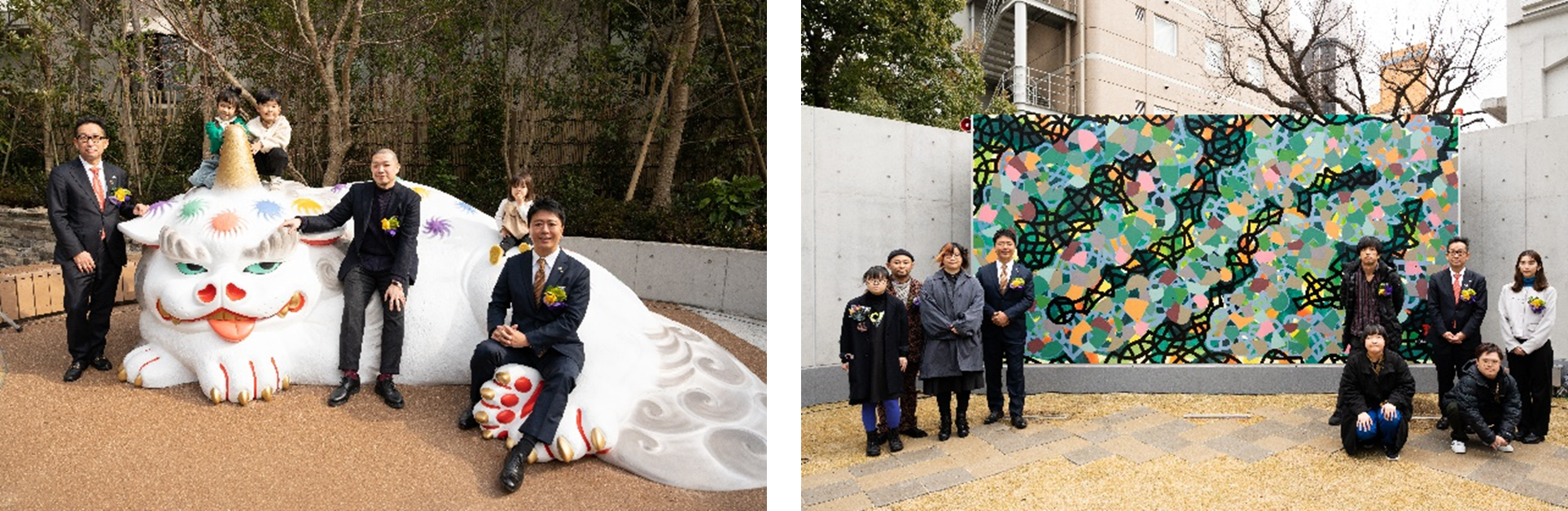 第三部では、福岡を代表するアーティストの人形師・中村弘峰さんと医療法人清明会 障がい福祉サービス事業所PICFA(ピクファ)に所属のアーティスト・本田雅啓さん、代表の原⽥啓之さんにご登壇いただき、大狛犬遊具「大名の大狛犬」とアートボードのお披露目をいたしました。