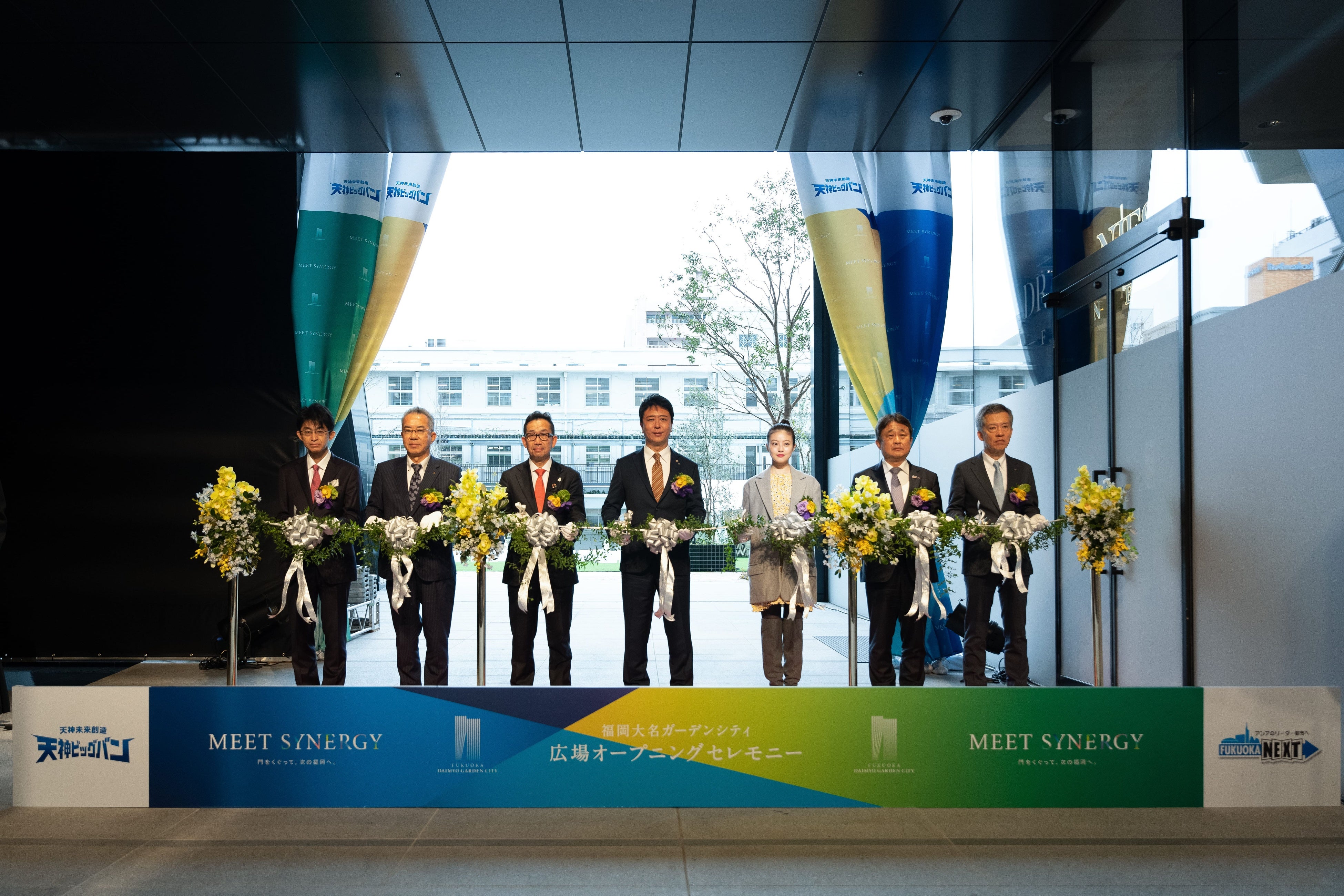 オープン前に行われたオープニングセレモニー第一部では、福岡市高島市長と大名プロジェクト特定目的会社の各代表者5名、さらに福岡出身で女優として活躍している今田美桜さんがゲストとして地元・福岡に駆けつけていただき、テープカットを実施いたしました。今回のオープンを受け、高島市長はこのみどり豊かな広場が、地域の方々から愛され、新たな交流拠点となることへの期待感を表されていました。積水ハウス専務執行役員の石井は市民の憩いの場だけでなく、様々な人が融合し、情報発信やカルチャーを楽しむ場など、“カタチにとらわれない使い方”をしていただきたいと思っております。とコメント。さらに、跡地である大名小学校出身アーティストの瀧北榮山さんによる、跡地大名小学校の校歌をもとに作られた曲の演奏と共に「福岡大名ガーデンシティ」の門出を祝いました。