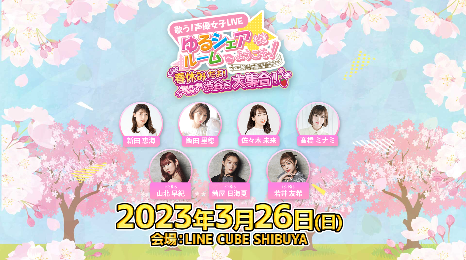 人気シリーズ、“歌う!声優女子LIVE ゆるシェアルームへようこそ!〜渋谷公園通り〜”の第3弾を、2023年3月26日(日)に東京・LINE CUBE SHIBUYAで開催する。