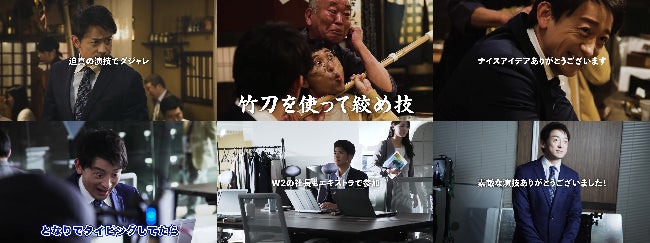現場に⼊った⼭本さんはディレクターからの説明を受け、空⽿を思いついた演技をスタート!アイデアを ひらめいたときの演技があまりにも迫真で、ダジャレとのギャップに現場では笑いをこらえられない⼈が 続出!最終的にはディレクターもカットをかける前に笑ってしまう事態となりました。サブキャストの ⽅々の演技もインパクトたっぷり。中でも⽵⼑で技をかける達⼈と、技をかけられるお客さんの演技には、 ⼭本さんも笑いを耐えきれなくなるほど。オフィスシーンでは、W2の社⻑や社員もエキストラとして参 加。終始笑いに包まれた中、撮影は順調に進んでいきました。
