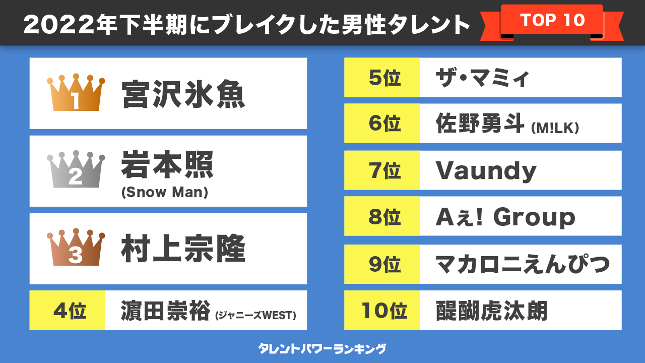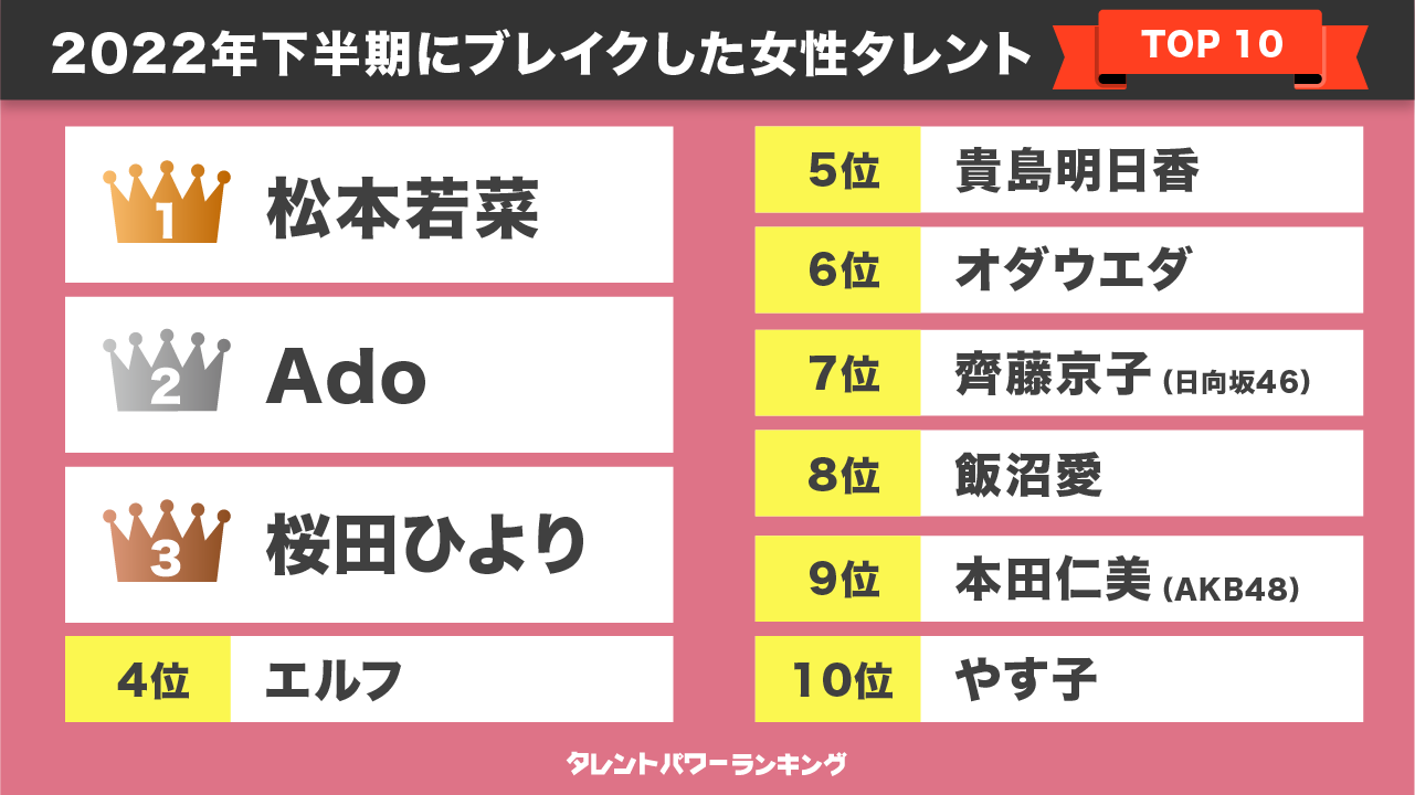 『タレントパワーランキング』では、様々なジャンルで2022年下半期に活躍しブレイクしたタレントについて、男女別でそれぞれランキング形式にまとめました。