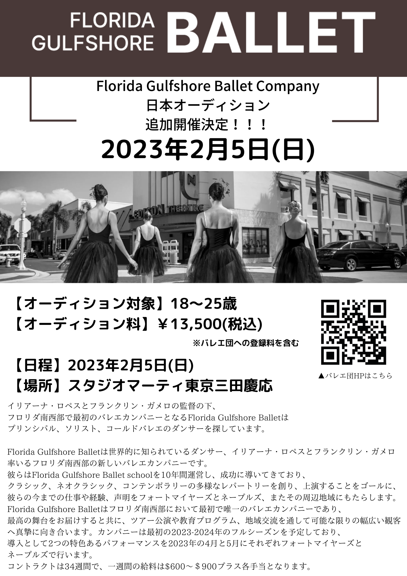 プリンシパル、ソリスト、コールドバレエダンサーを募集します。