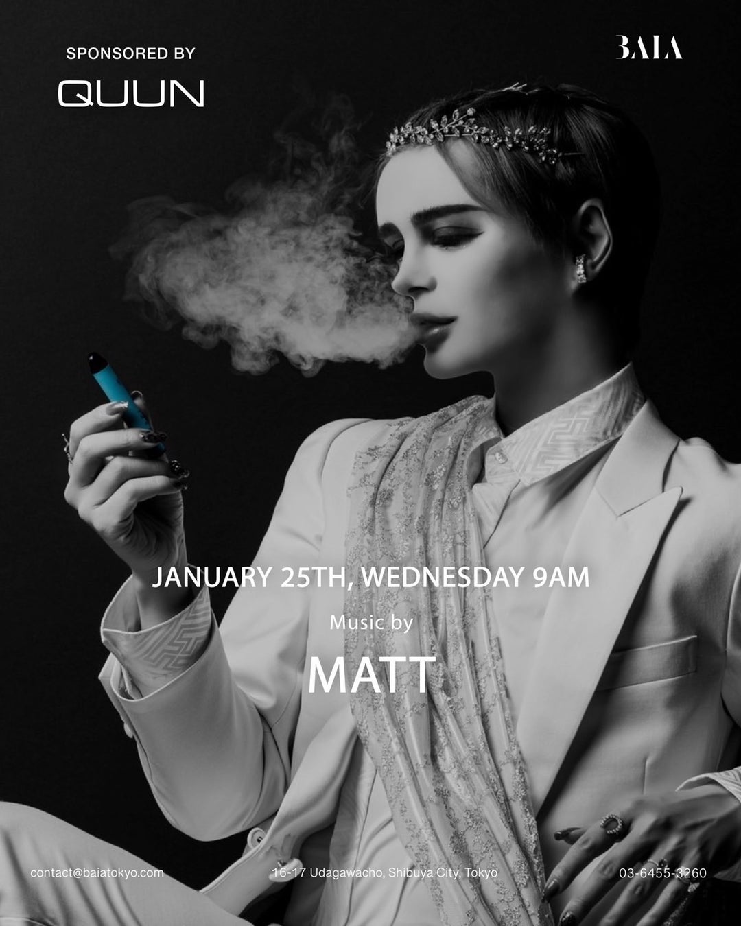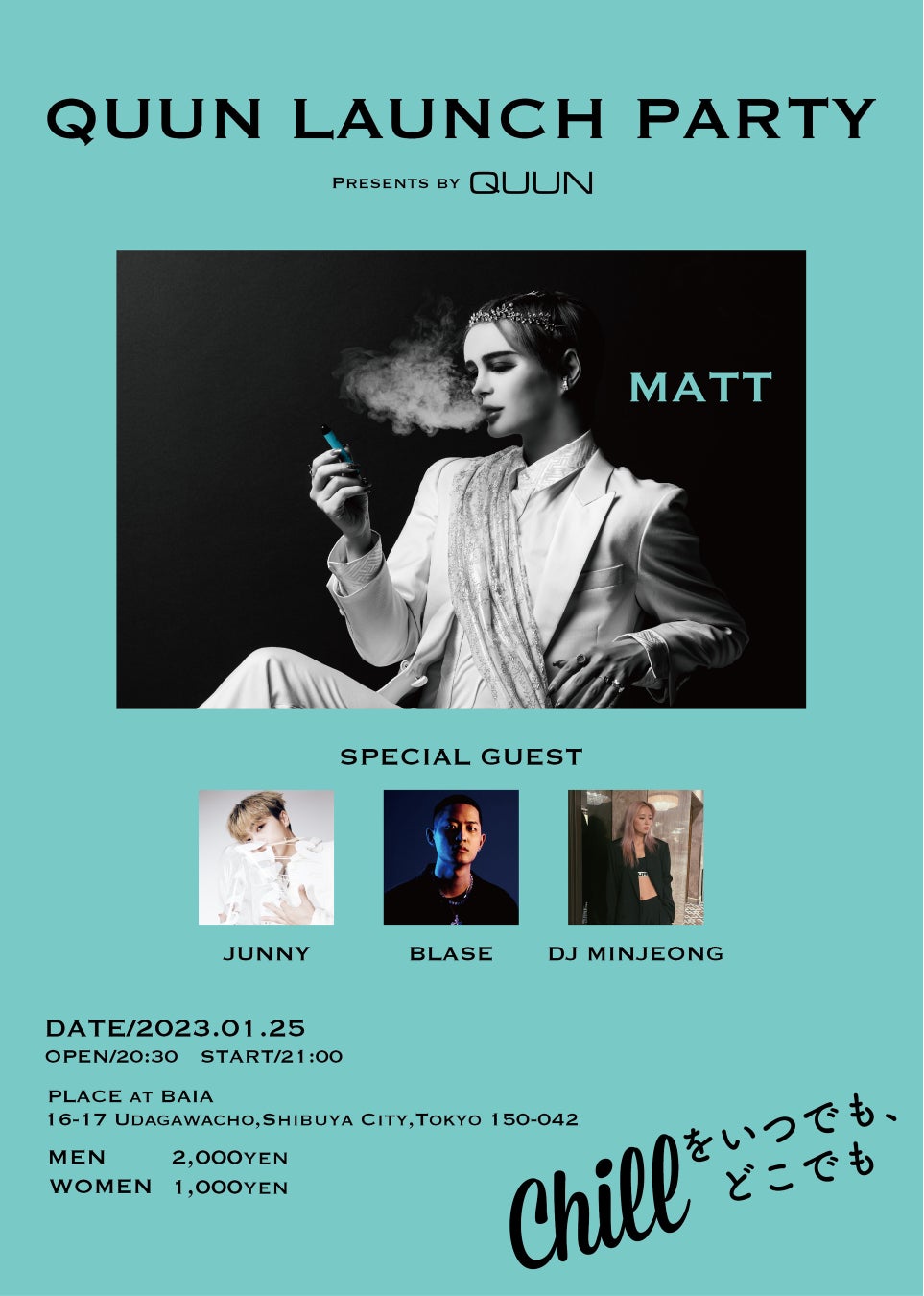MattさんのQUUN公式アンバサダー就任を記念した、極上の音楽とチル体験ができるクラブイベントです。会場では、QUUNの人気フレーバーをお試しいただけます。また、Mattさんもゲストとして参加いただきます。その他人気のアーティストが出演。会場一体となってお楽しみ頂けます。