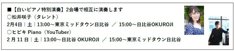 本イベントは、エンターテインメントを軸に日比谷エリアの活性化を担う東京ミッドタウン日比谷と日比谷OKUROJIの2施設が共同で初開催するアート×音楽のストリートピアノイベント。入場料無料でどなたでも自由にピアノを演奏していただくことが可能です。ピアノを弾けない方も、ひときわ目を引く白いピアノと白いアートは見るだけでもお楽しみいただけます。アートを手掛けるのは、スプレーアートの第一人者であるAKI氏。2月4日(土)には松井咲子さん、2月11日(土)にはヒビキPianoさんによる特別演奏も開催いたします。イベント開催期間中は、素敵な賞品が当たるインスタグラムキャンペーンを開催いたします。ぜひ皆さまお立ち寄りください。