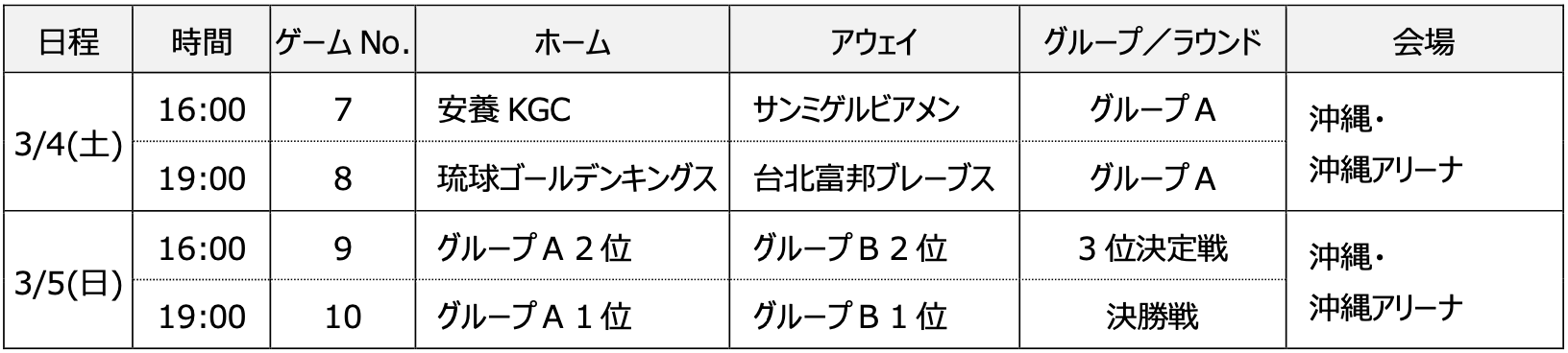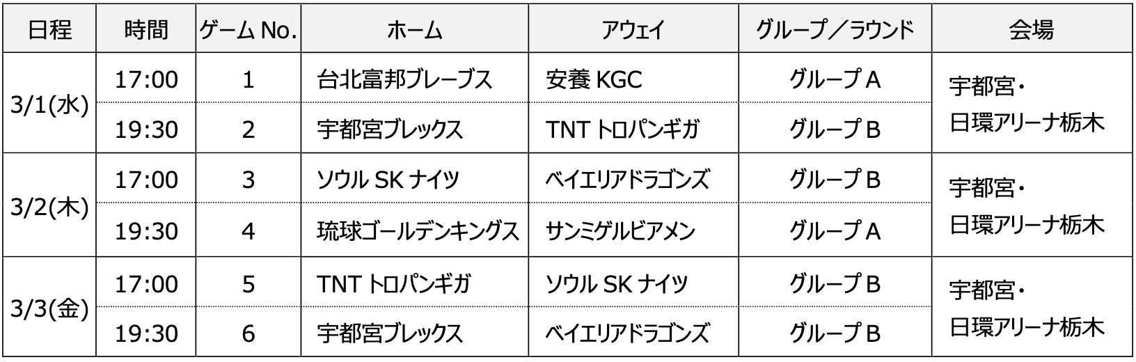 大会は2023年3月1日(水)から5日(日)にかけて、日本国内で全10試合が行われます。B.LEAGUEの昨シーズンファイナル王者である宇都宮ブレックスの本拠地の1つである日環アリーナ栃木では、グループステージ最初の6試合を開催。同準優勝の琉球ゴールデンキングスの本拠地であり、2023年FIBAワールドカップ会場でもある沖縄アリーナでは、グループステージ2試合と3位決定戦、そして決勝戦の計4試合が開催されます。