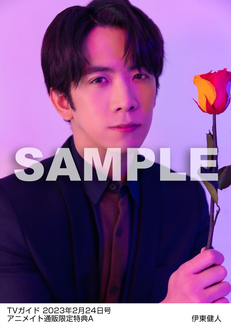 また、アニメイト通販にて「TVガイド2023年2/24号」を購入すると、特典として伊東健人の生写真がプレゼントされる限定企画も。華やかでカラフルなバラを持った妖艶なカット、メガネ姿で笑顔を見せるエレガントなショットの全2種類の絵柄のなかから1枚を選ぶことができる。