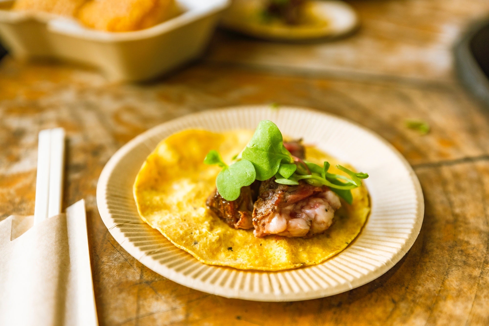 森枝氏はこのイベントのために特別なBBQコースを考案。寒い冬の野外で味わうのにぴったりなクラムチャウダーやお粥、青いノンアルコールジントニックのほか、BBQ台で焼き上げたステーキを挟んだタコスやスペアリブのマッサマンカレー、スモアなどを用意。来場者は、この場でしか味わえないBBQコースに舌鼓を打っていました。