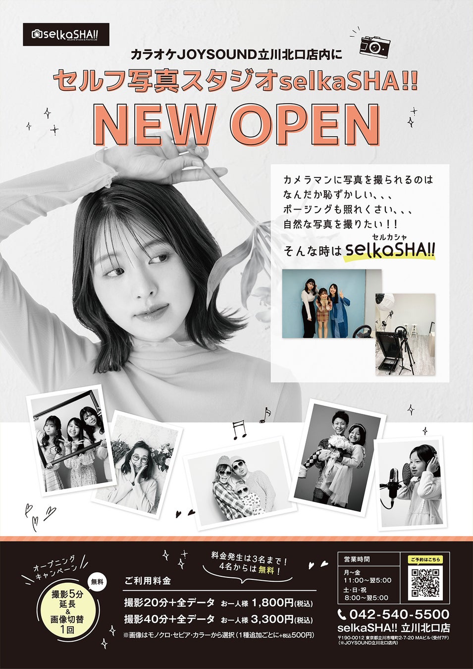 株式会社エクシングの子会社で、全国にカラオケ店舗を展開する株式会社スタンダード(本社:東京都港区、代表取締役社長:米田洋一)は、2023年1月30 日(月)、カラオケ店舗「JOYSOUND立川北口店」(東京)内に、カラオケルームの完全個室の特性を生かしたセルフ写真スタジオ「selkaSHA!!(セルカシャ)」の1号店をオープンします。