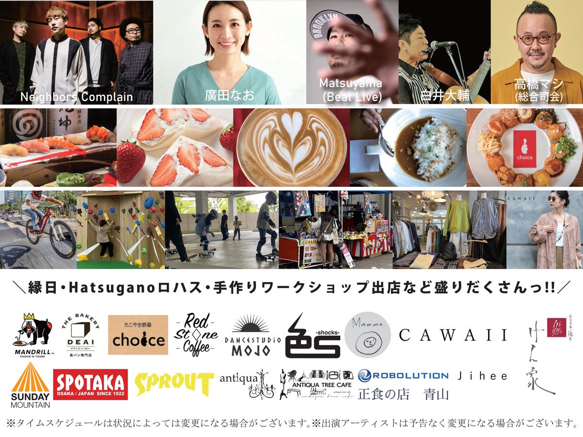 イベント会場自体への入場は無料。ブラックミュージックをルーツとする大阪発の4人組バンド「Neighbors Complain」のライブのほか、「美筋ヨガ」の考案者・ヨガインストラクターの廣田なおさんによるヨガレッスン、シンガーソングライターの白井大輔さんや、ダンスパフォーマンスなど、さまざまなエンターテインメントがお楽しみいただけます。