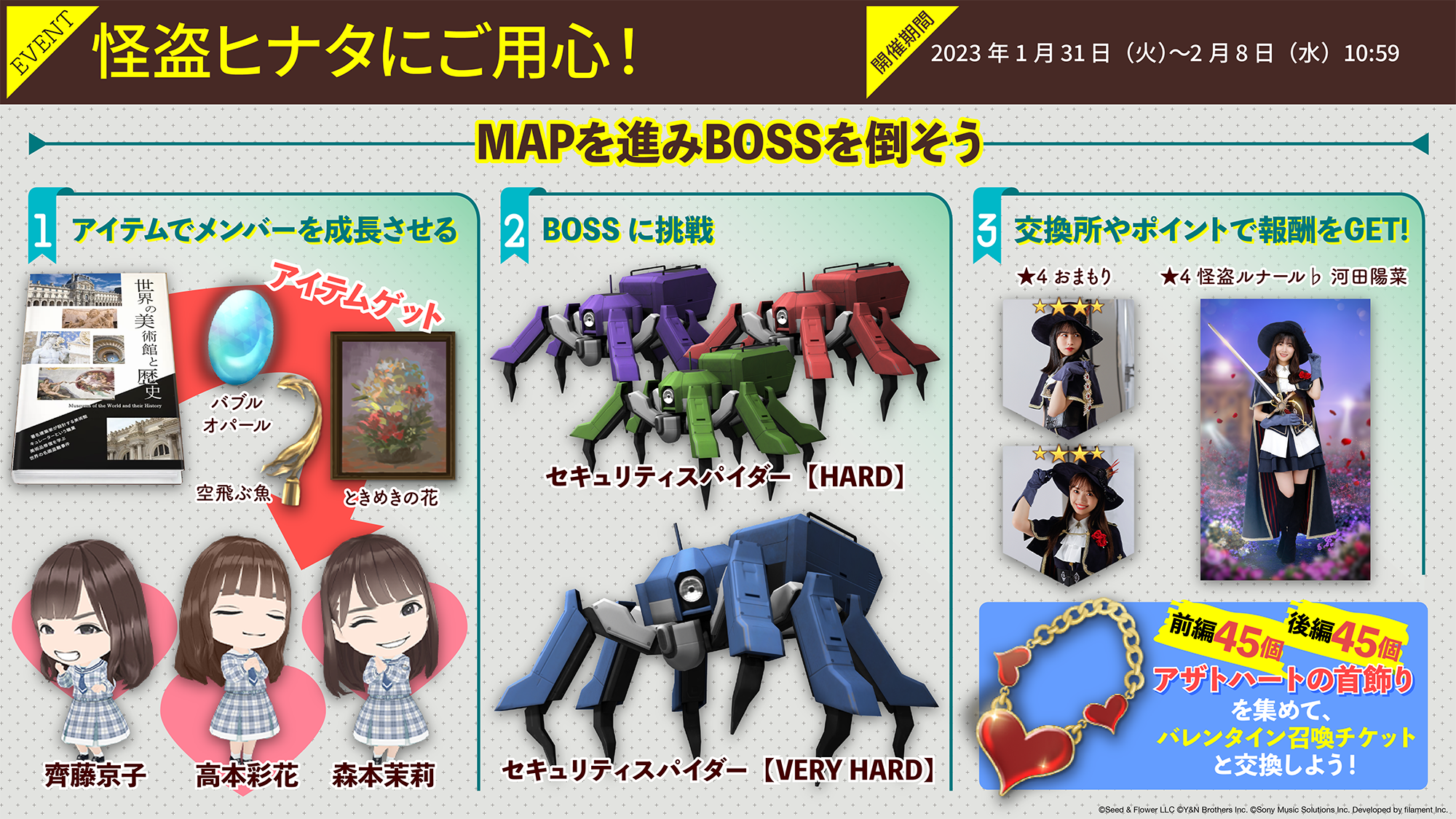 「怪盗ヒナタにご用心!」と次回開催イベントで合計90個【アザトハートの首飾り】を集めると、「★4バレンタインメンバーカード確定召喚チケット」と交換することができます!