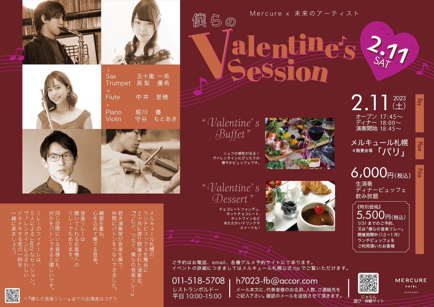 メルキュール札幌(所在地:札幌市中央区南4条西2丁目2-4、ホテル支配人:カーセル クリストファー)は、2月11日(土)、同ホテル宴会場「パリ」にて、音楽とバレンタインディナービュッフェのイベント『僕らのバレンタインセッション』を開催致します。