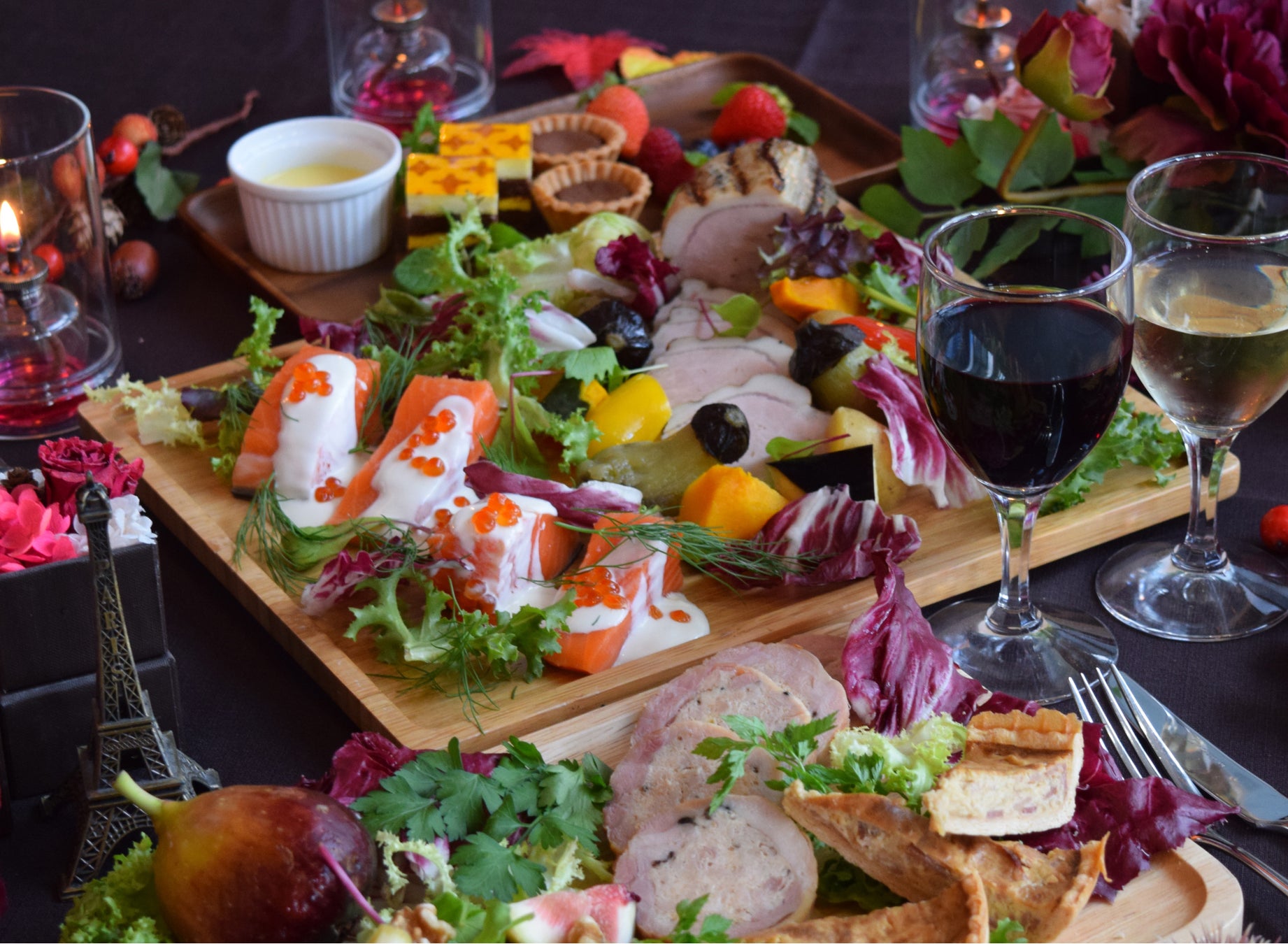 ブランデーに漬け込んだドライフルーツとクリームチーズのカナッペ、華やかなエディブルフラワーのサラダ、