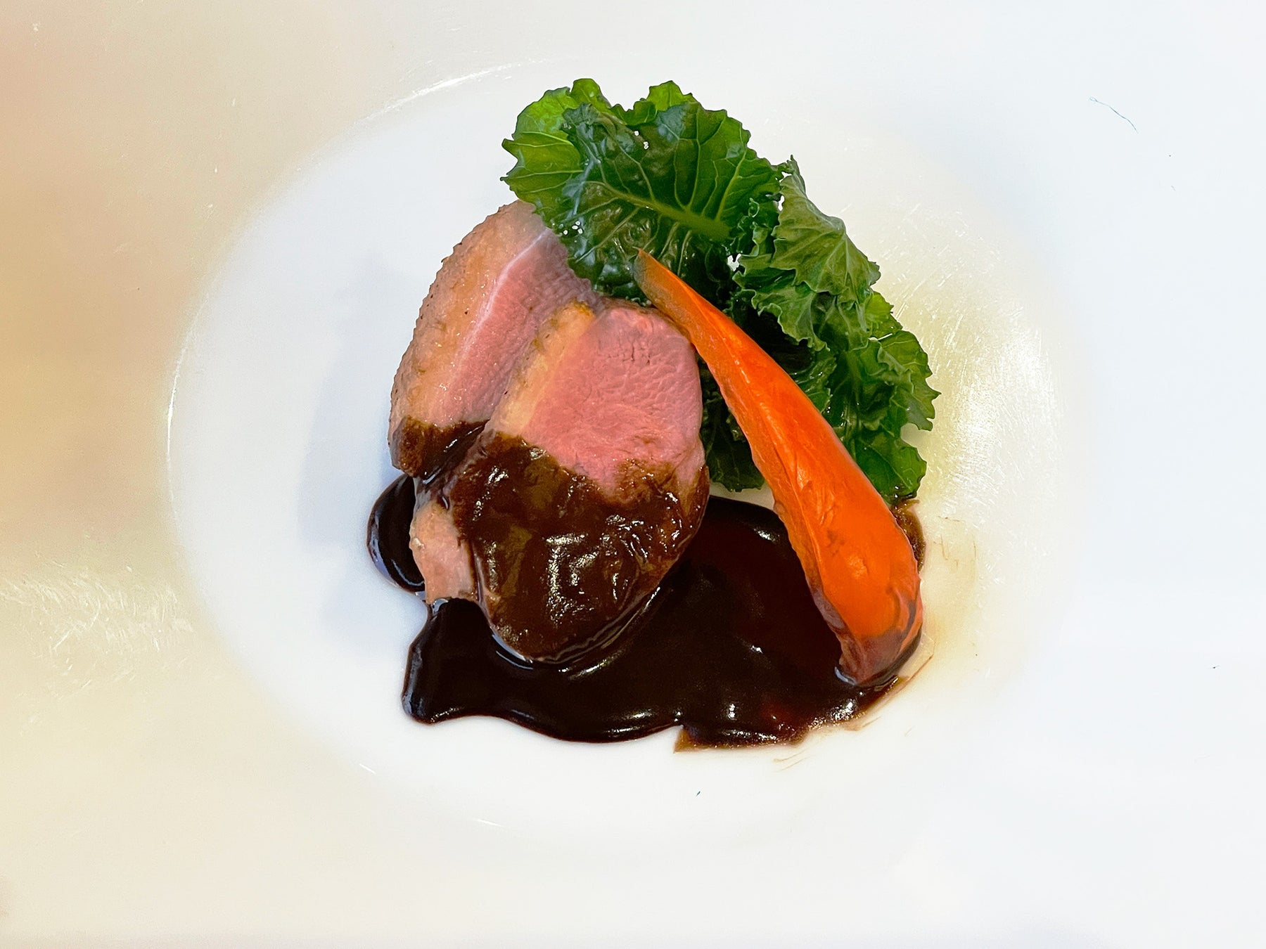 チョコレートをアクセントに効かせた「鴨胸肉のロティ チョコレートバルサミコソース」、