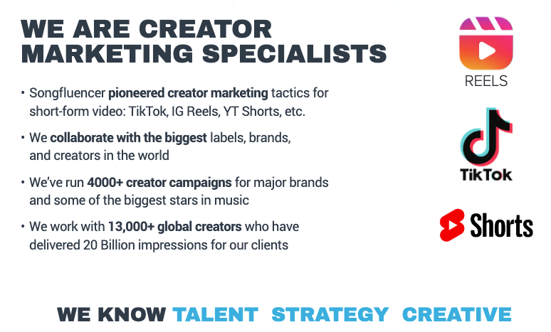 また、SongFluencerは北米・南米、東南アジア、オーストラリア、ヨーロッパ、サハラ以外の諸国にも15,000人以上のインフルエンサーを擁する世界最大級のデータベースを保有している他、2021年には楽曲の再生数に応じたリワードを提供することで音楽レーベルとTikTokクリエイターをマッチングするプラットフォームPreffyの買収を発表するなど、音楽マーケティング業界における世界的なリーディングカンパニーとなっております。