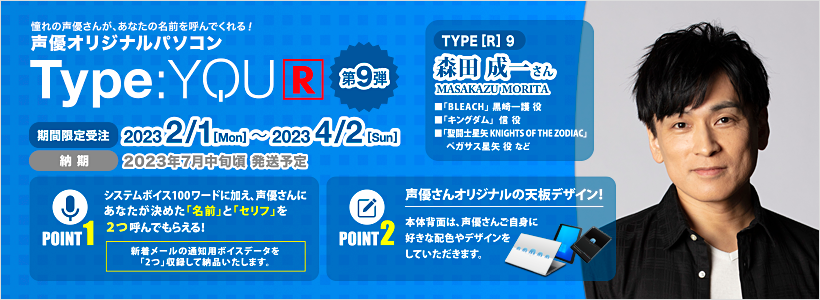 ![声優オリジナルパソコンのリバイバルシリーズに森田成一さんが登場!【Type:YOU[R] -タイプユーアール-】第9弾は2月1日よりスマッシュコアで受注開始!](https://entamerush.jp/wp-content/uploads/2023/02/2023-02-01_12-28-21_075969.jpeg)