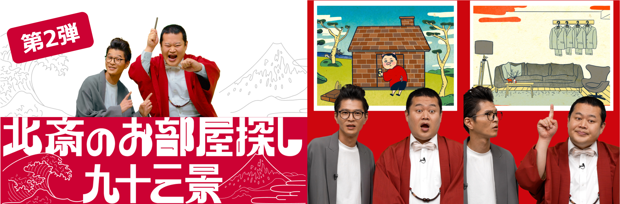 本シリーズは、生涯93回の引越しをしたという逸話をもつ、江戸時代を代表する浮世絵師・葛飾北斎が現代に転生してお部屋を探す様子を描いた動画です。2021年M-1グランプリファイナリストであるモグライダーのともしげさんが葛飾北斎となって、北斎風のイラストとショート漫才で面白おかしく表現しています。1月19日に配信を開始した第1弾のショート漫才に対してSNS上では、「芝さんのツッコミが的確すぎる!」「背景のともしげさんのイラストが癒される。」「30本一気に見てしまった!」など話題に!第2弾でもおとぎ話の三匹の子豚を連想する3本連続のネタや芝さんの家にそっくりな物件が登場するなど、理想のお部屋を探し続けるお二人のショート漫才にご注目ください。