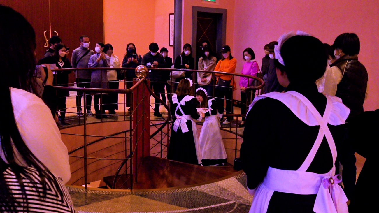 観客はお屋敷の訪問客という設定であり、役者のメイドたちが出迎える。