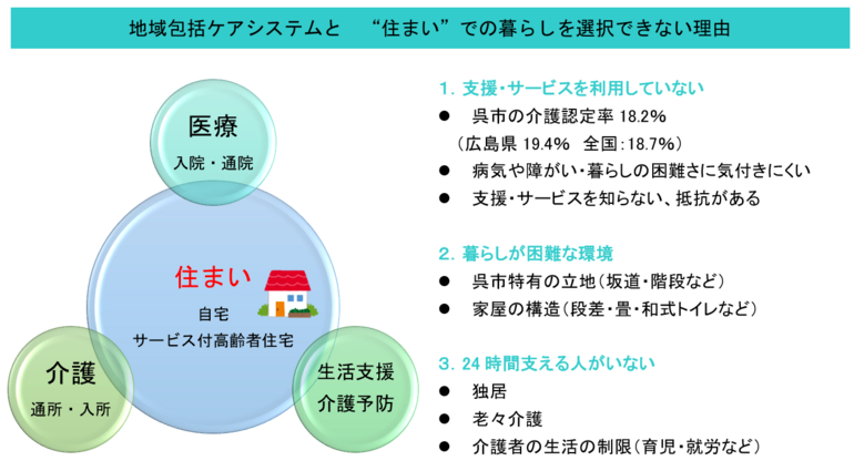 伊藤氏は、災害医療派遣チーム(DMAT)の隊員資格取得後、様々な派遣活動を行う中、2018年の西日本豪雨 災害時には家屋全壊により被災者となった家族を自宅に集め、10名以上で“ともに暮らす”経験をしました。また、自身の家族の介護・看取り、また看護の現場での経験。高齢化率は35.9%と高い割合で推移する呉市で、ひとりでも多くの方が、住み慣れた場所で“幸せ”と感じられる人生を歩めるような地域づくりに従事したいという思い から、「ホームホスピス」の設立を決意。