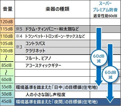 ① これまで、クラリネットなどの100dB~105dB/500Hzの楽器※3は、日中のみ使用可能とご案内しておりましたが、『スーパープレミアム防音』★★★★では夜間のご使用も可能となります。