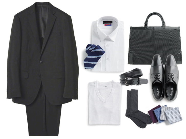 ▽計8点:スーツ(20,900円)・シャツ(4,290円)・ネクタイ(4,290円)・ベルト(4,290円)・シューズまたはバッグ(8,690円)・肌着(880円)・靴下(880円)・ハンカチ(880円)