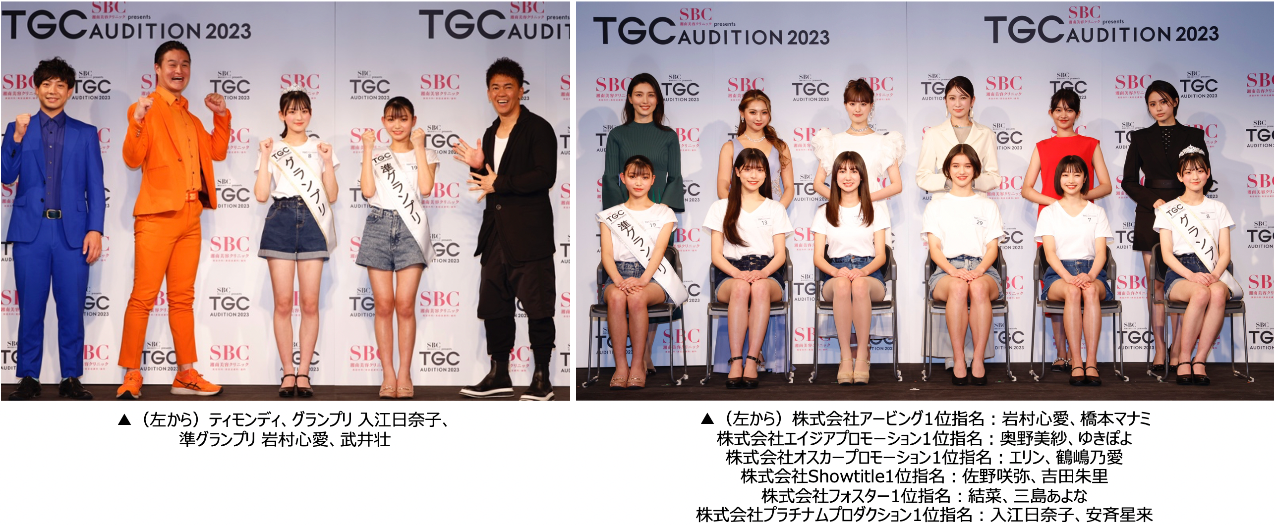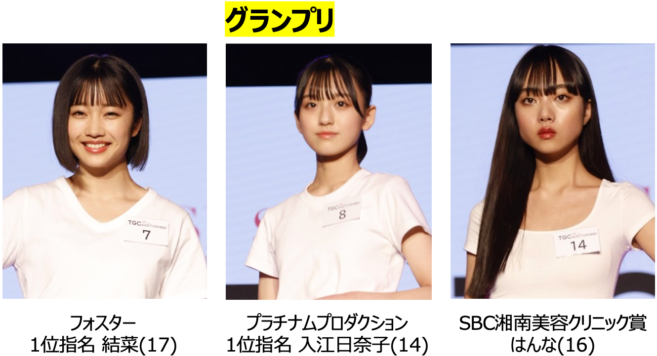 東京ガールズコレクションを企画・制作する株式会社W TOKYO(本社:東京都渋谷区/代表取締役社長:村上範義)は、史上最大級のファッションフェスタ「東京ガールズコレクション(以下、TGC)」がプロデュースする、日本最大級のガールズオーディションプロジェクト「SBC湘南美容クリニック presents TGC AUDITION 2023」の、選択指名制度を導入した公開ドラフト会議を2023年2月5日(日)、ベルエポック美容専門学校 第二校舎で開催しました。モデル、タレント、女優、アーティストを目指す9歳以上の女性(2022年9月時点で小学4年生以上の方)で、特定の芸能プロダクションに所属していないアマチュアの方を対象に、今年は6,500人もの応募の中から1次審査〜4次審査を通過した32名が最終審査に挑みました。そして、公開ドラフト会議で各事務所から1位指名を受けたファイナリスト6名から、見事グランプリに入江日奈子さん(14)、準グランプリに岩村心愛さん(13)が輝きました。グランプリの入江さんは「グランプリに選んでいただいて、まだ正直実感が湧いていないのですが、努力してきたことが実って嬉しいです。」と語りました。 また、SBC湘南美容クリニック賞にははんなさん(16)が選ばれ、この3名は、2023年3月4日(土)に開催予定の『第36回 マイナビ 東京ガールズコレクション 2023 SPRING/SUMMER』の出演が決定。プレゼンターの武井壮さんは、「私は30歳を超えて芸能界に挑戦しようと思い立ったので、その時の初心を思い出しました。」と熱い気持ちを語りました。