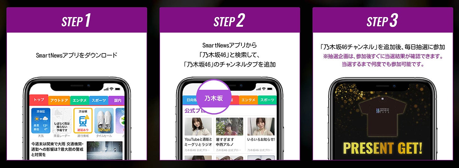 スマートニュース株式会社は、日々進化するグループやメンバーの姿を、より便利で簡単な方法でファンの皆様にお届けしたい、アーティストとファンの皆様との絆を深めていきたいという強い想いのもと、2018年にニュースアプリ「SmartNews」に「乃木坂46」チャンネルを開設。メンバーの公式情報や公式ブログ、最新関連ニュースをまとめて閲覧できるため、多くのファンの皆様にお使いいただいています。今回は、【乃木坂46 11th YEAR BIRTHDAY LIVE】をファンの皆様とともに盛り上げるべく、さまざまなプレミアム企画をご用意。ファンの皆様がチャンネルを通じて、少しでもメンバーを近く感じ、ライブが開催される前から後までを楽しむことができればと考えています。詳細はスペシャルサイトを(http://nogizaka46.smartnews-present-01.jp/)をご覧ください。
