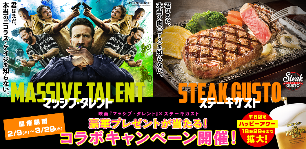 | 【映画『マッシブ・タレント』コラボキャンペーン おすすめポイント】 ①【ステーキガスト限定プレゼント】29組58名様に「公開前試写会ご招待券」が当たる 期間中のご来店で、試写会招待券や映画オリジナルグッズなど、ファン垂涎の限定グッズが当たるコラボキャンペーンです。 ②【お得な時間延長】ハッピーアワーが18時29分まで拡大する「マッシブアワー」実施 |