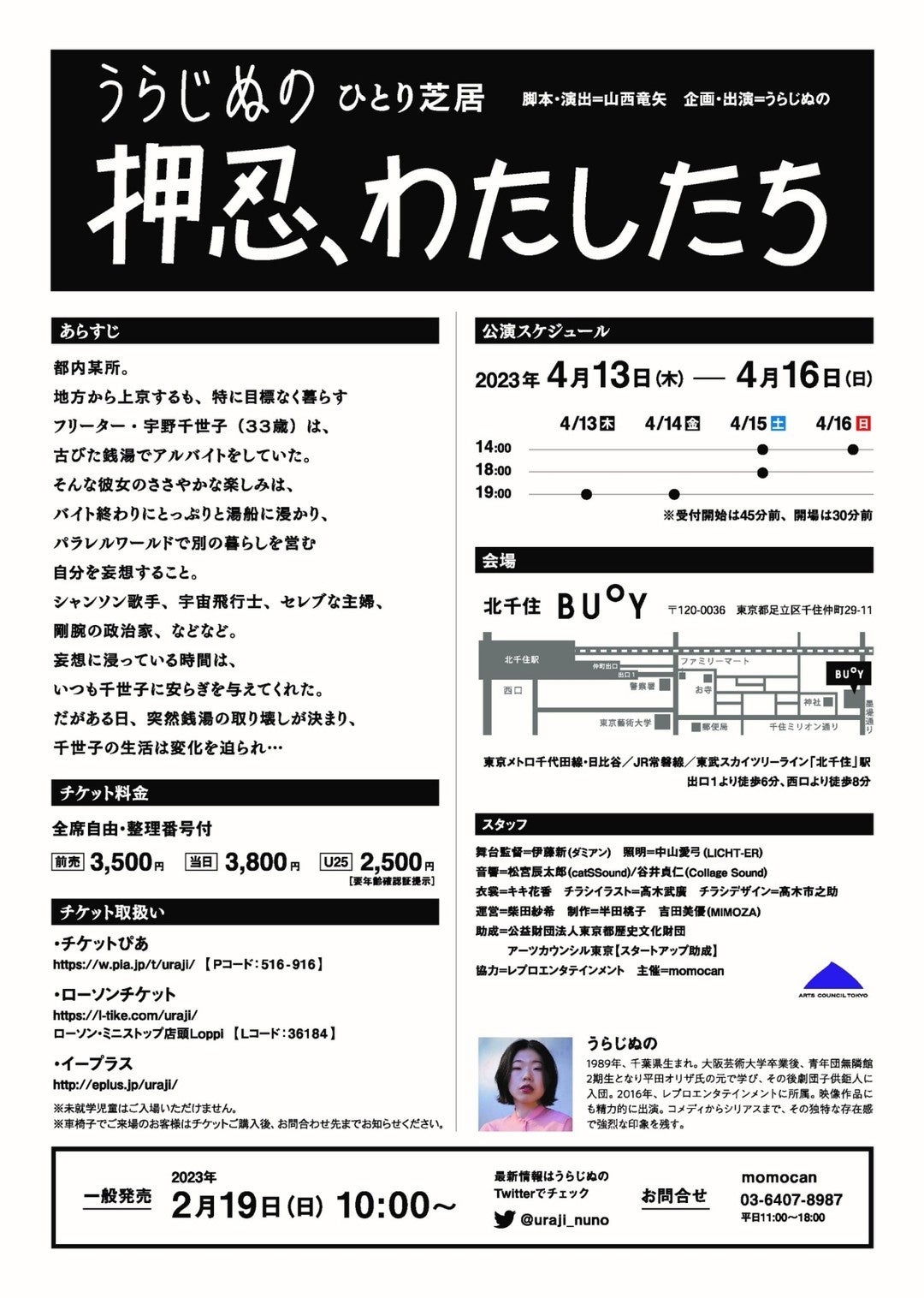 うらじぬの ひとり芝居『押忍、わたしたち』は2023年4月13日から北千住BUoYにて上演。チケットのオフィシャル先行を2月9日(木) 12:00~2月15日(水) 23:59に実施。一般発売は2月19日(日)10時より。