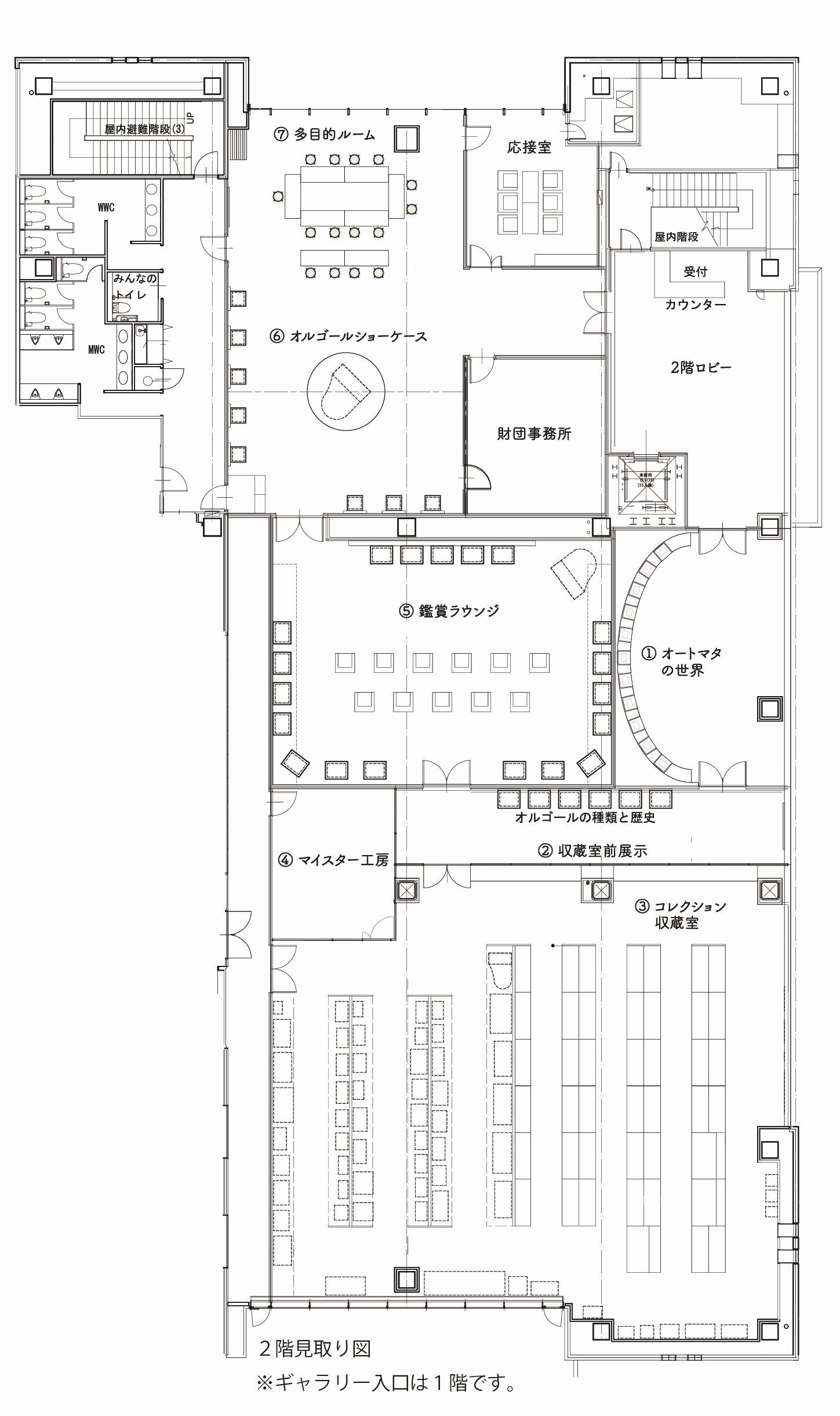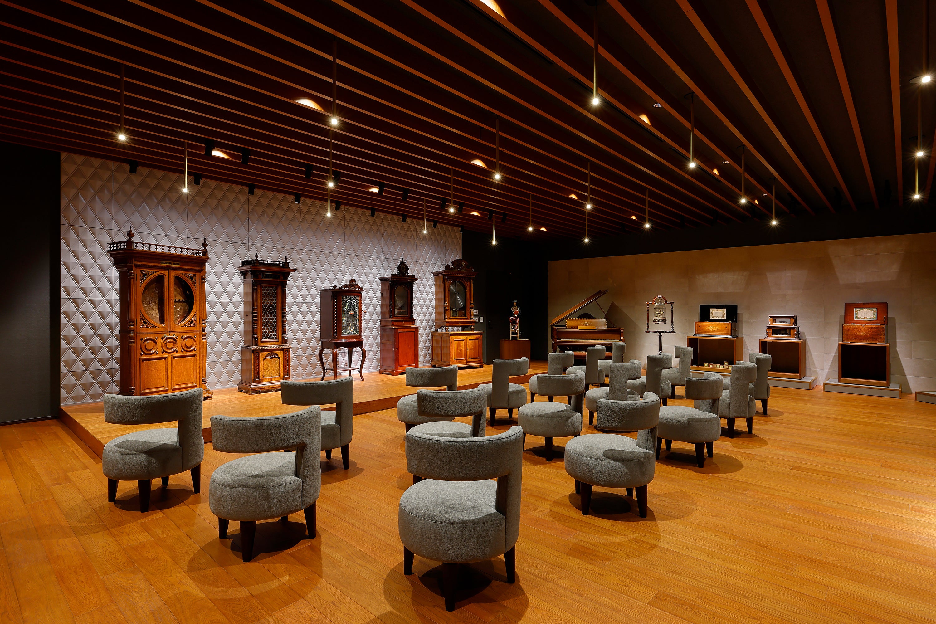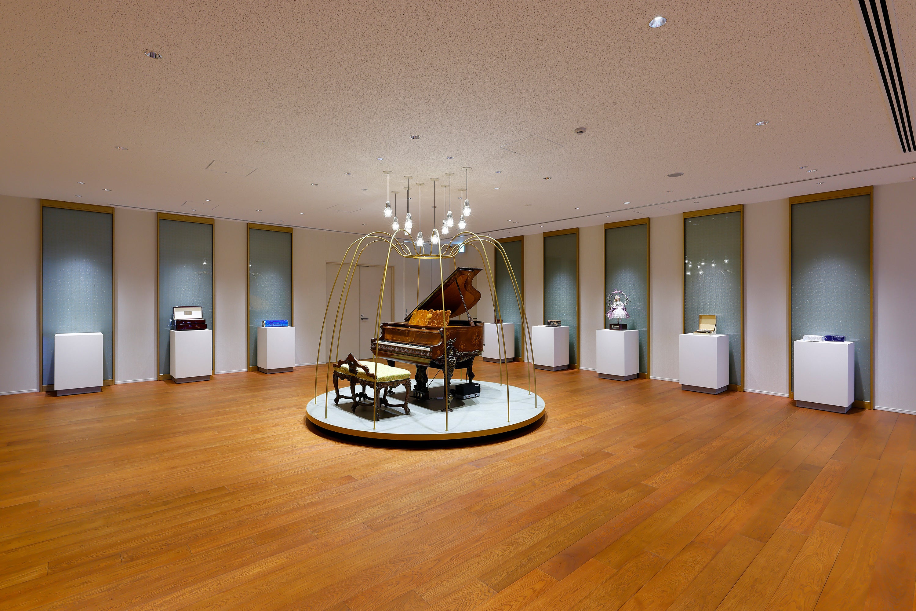 ギャラリーの最大の特徴ともいえる「鑑賞ラウンジ」は、バラエティに富んだコレクションをコンサート形式にてお楽しみいただけます。その他、ホログラムによる、カラクリ人形の演出展示をお楽しみいただける「オートマタの世界」、伝統工芸とのコラボレーションや最先端技術を駆使した作品を紹介する「オルゴールショーケース」。「マイスター工房」では、オルゴールエンジニアがコレクションの状態を維持伝承するために日々メンテナンスを行っています。オルゴールエンジニアがアンティークオルゴールを修復する様子を間近で見学することも可能です。