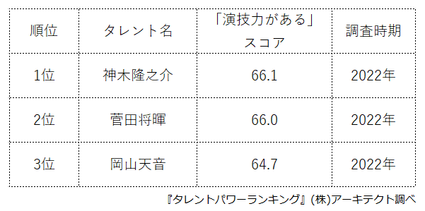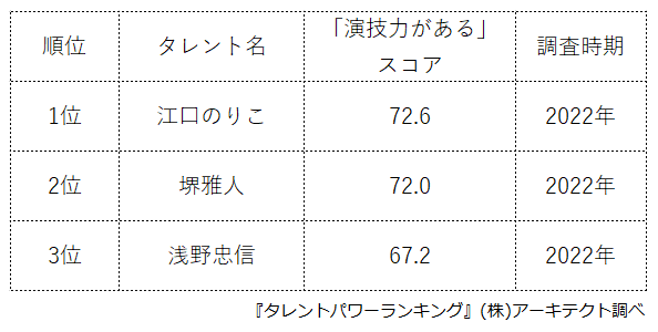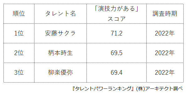 『タレントパワーランキング』では、タレントパワーランキングに登録されている「演技力がある」イメージを持たれている俳優・女優のスコアを調査。