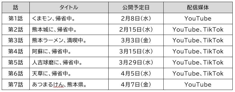 動画制作に当たっては、様々な最新技術を有するサイバーエージェント社とタッグを組み、3Dスキャンやモーションキャプチャ等のCG技術を駆使することで再現された、本物と見間違うほど精巧なCGのくまモンが大活躍します。動画は全7話構成で、2月8日(水)から4月上旬にかけて、特設サイト、YouTube及びTikTokで公開していきます。