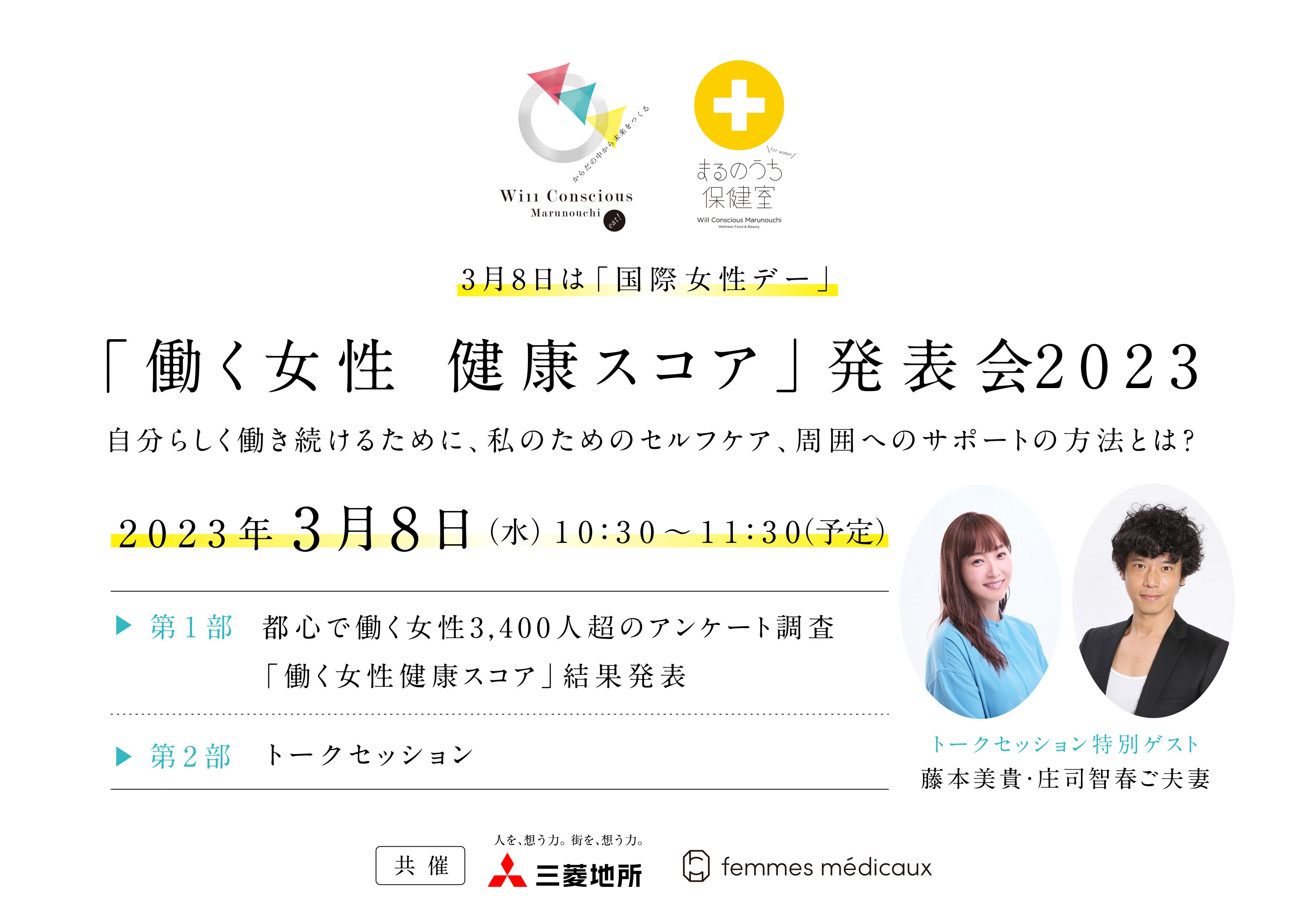 三菱地所株式会社は、国際女性デーに向けたアクションとして、「Will Conscious Marunouchi※1」から働く女性※2をサポート・応援する取り組みとなるオンライン・オフラインイベントを開催します。株式会社ファムメディコと共催で神奈川県立保健福祉大学の協力のもと、働く女性たちの課題を見える化する産学医連携プロジェクト「働く女性 健康スコア」の発表イベントを3月8日(水)にオンラインで開催します。また、対話することを大切にしたオフラインイベント「私と向き合う時間」を2月26日(日)と3月10日(金)の2回にわたって開催します。