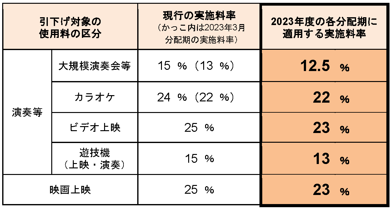 日本音楽著作権協会(JASRAC)は、2023年度(2023年4月から2024年3月)の各分配期に適用する管理手数料実施料率を以下の表のとおり引き下げます。対象となる使用料の区分は、「大規模演奏会等」「カラオケ」「ビデオ上映」「遊技機(上映・演奏)」「映画上映」です。