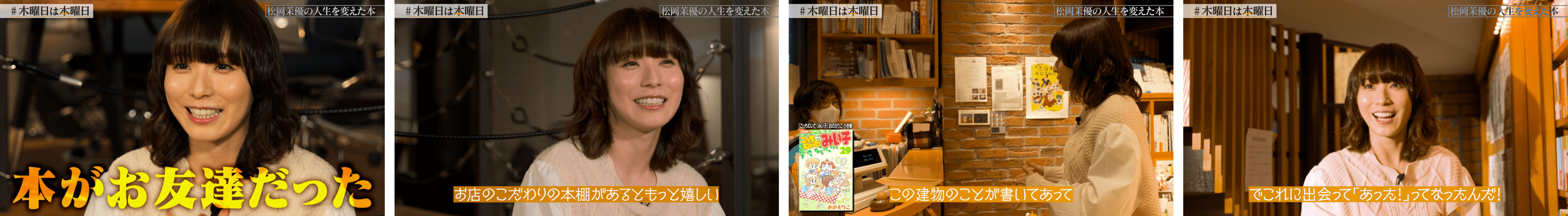 「#木曜日は本曜日」プロジェクト第18弾では女優の松岡茉優さんにご協力いただきました。動画前半では、松岡さんが「人生を変えた本」として選書いただいた10冊の中から、「幼い頃、母に何度も読んで貰った本」、「些細な傷ついた心を癒してくれる本」などについてお話しいただきました。動画後半では山陽堂書店(東京都港区)を訪れ、松岡さんの本屋の巡り方や、ご自身が愛読されている本についてお話しいただきました。また松岡さんが「女優をやっていてこれ以上の日はない」と語る松岡さんが憧れる小説家とのエピソードは必見です。
