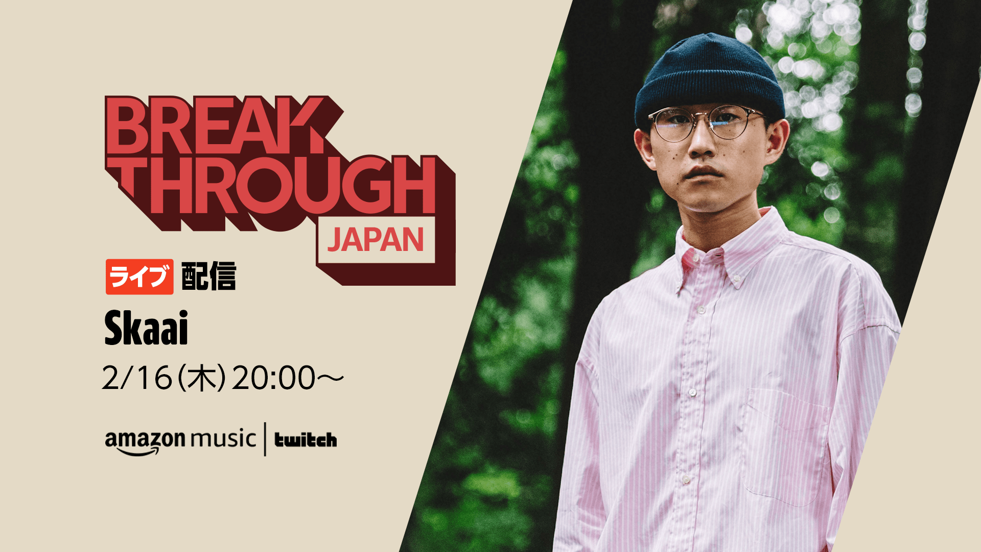 Amazon Musicは、次世代のミュージックシーンを担う選りすぐりのアーティストが出演するライブイベント「BREAKTHROUGH JAPAN Live」を、2月16日(木)20:00からTwitch上のAmazon Music Japanチャンネルにて開催します。第4回目となる今回は、ラッパーのSkaaiが出演します。