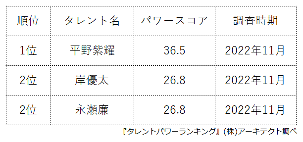 本ランキングは、2022年11月度に実施したタレント調査データ(一部過去実施データ)を利用し、タイトルに応じてランキング形式でまとめたものです。