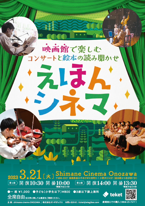 親子向けコンサートやイベント制作のワークショップを開催する株式会社オトギボックス(代表取締役:梶本大雅)が、2023年3月21日(火)にShimane Chinema Onozawaにて「えほんシネマ」を開催致します。