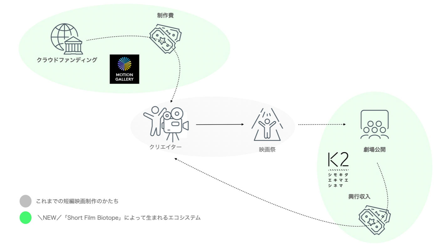 「MOTION GALLERY」での資金調達と、下北沢の映画館「K2」での劇場公開をつなぎ、一気通貫でサポートすることで、短編映画制作に新しい生態系を生み出し、インスピレーションに溢れた作品を世界にもたらし続けられる土壌をつくることで、これから世界に羽ばたこうとされている映画制作者をサポートしていきます。https://k2-cinema.notion.site/Short-Film-Biotope-23e0c1383e2043f2a70d09aecefe0017