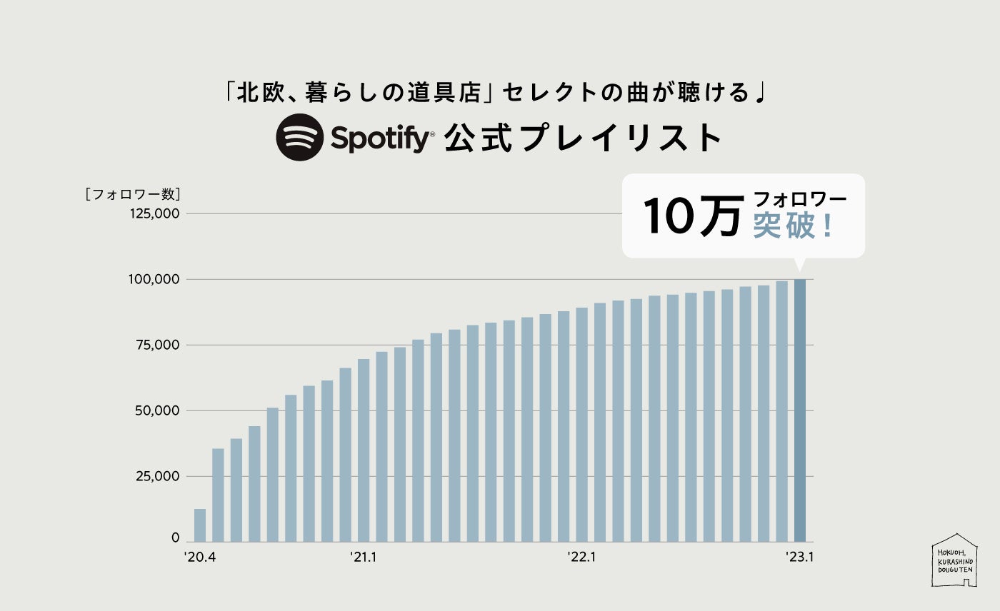 株式会社クラシコム(本社:東京都国立市、代表取締役:青木耕平、以下「当社」)が運営し、雑貨や衣類などの開発・販売、メディア運営などを行うライフカルチャープラットフォーム「北欧、暮らしの道具店」では、2020年4月からSpotifyにて公開しているプレイリストの合計フォロワー数が10万人を突破したことを発表いたします。合わせて、コロナ下で家時間が増える中で音声コンテンツの需要が増加している背景や、新しい曲との出会いとしてのプレイリストの可能性に着目したアーティストとのコラボ実績などを公表します。また、10万フォロワー達成を記念して、Spotify公式の「北欧、暮らしの道具店」特集ページ(URL:https://spotify.link/hokuohkurashi )が公開されました。