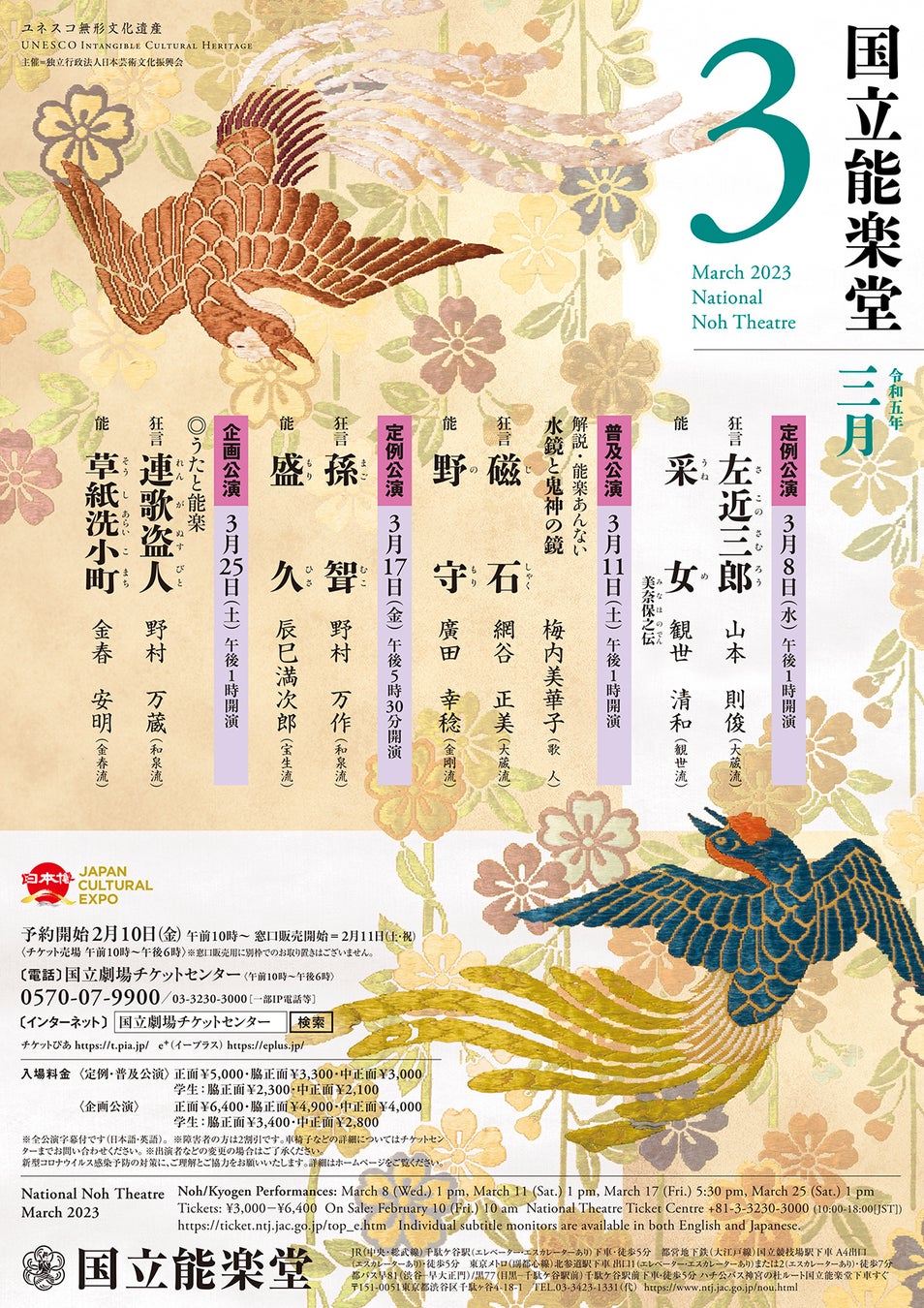 国立能楽堂(東京都渋谷区千駄ヶ谷4-18-1)の3月主催公演が下記の通り上演されます。