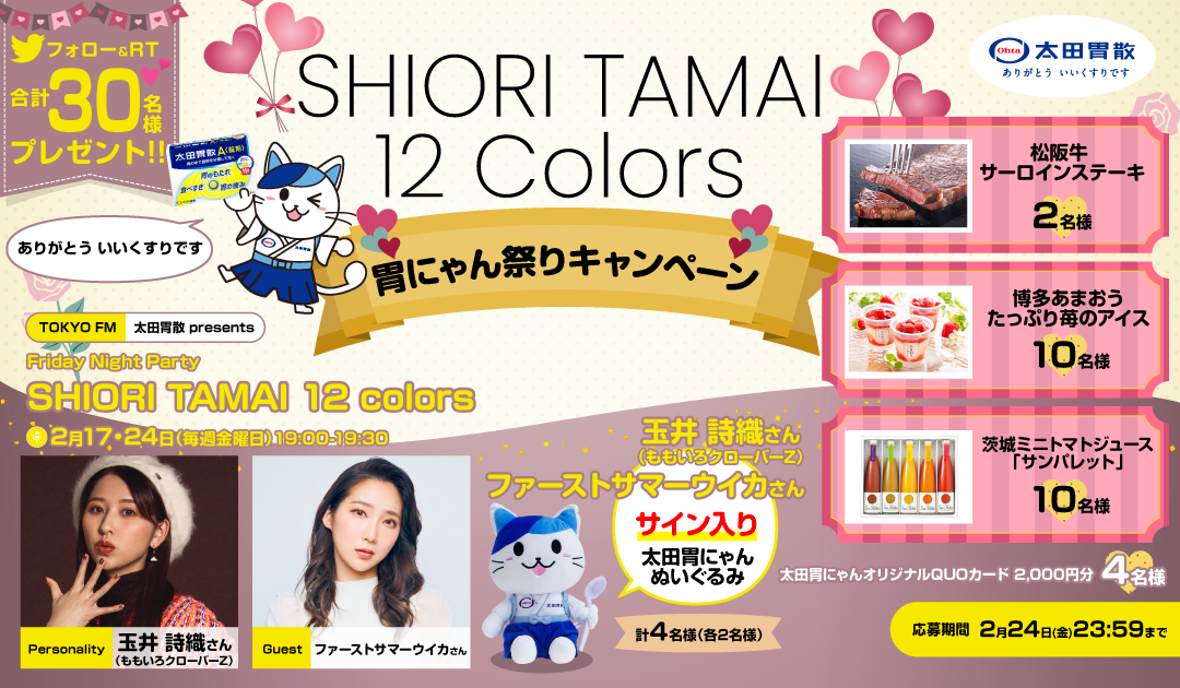 同社のTOKYO FM1ヶ月間限定プログラム「太田胃散 presents Friday Night Party SHIORI TAMAI 12 colors」<2月パーソナリティ:玉井詩織(ももいろクローバーZ)さん 毎週金曜日19:00~OA>とのコラボ企画となっておりますので、ぜひ番組ともにチェックしてください。