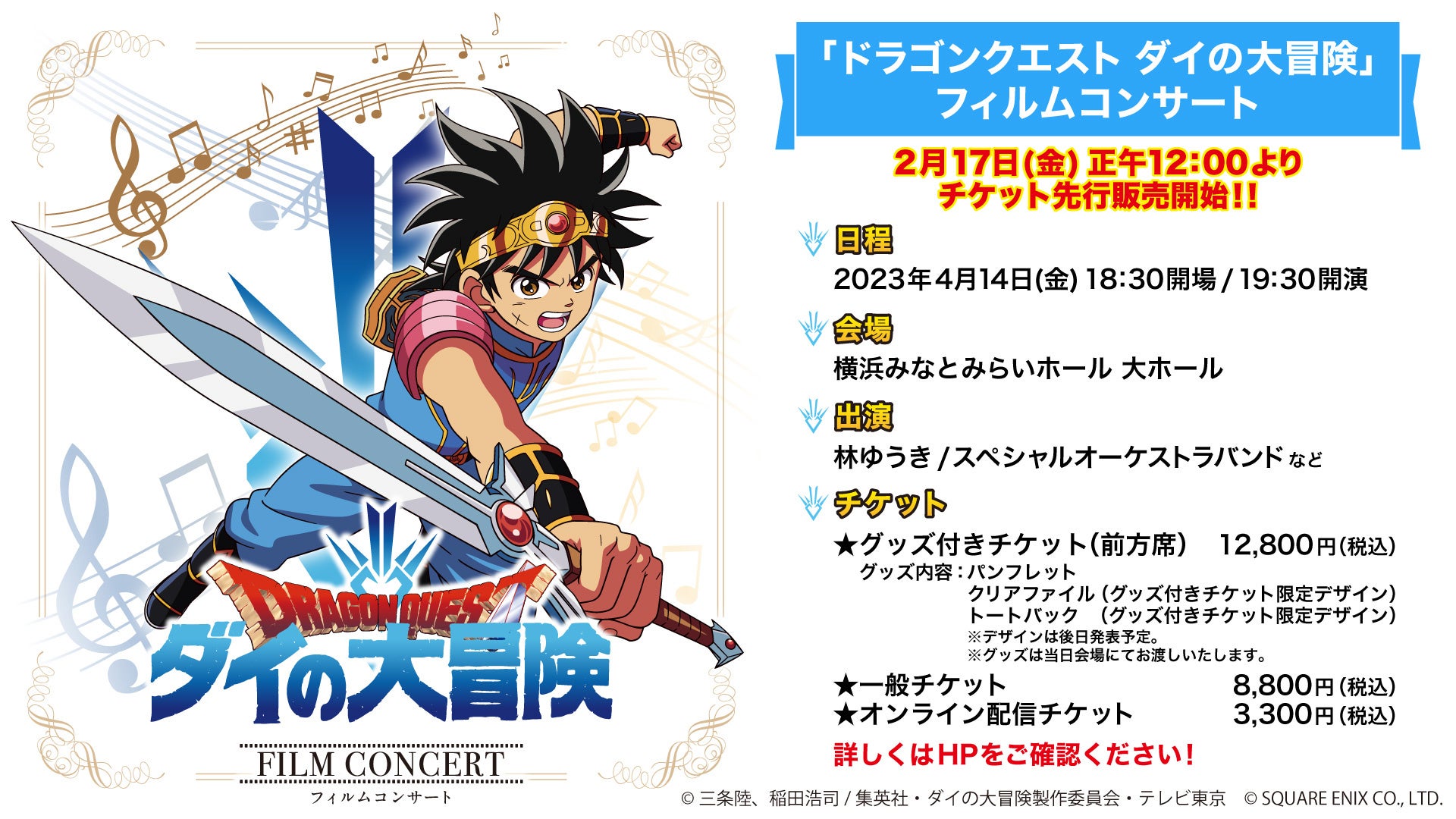 三条陸(原作)、稲田浩司(作画)、堀井雄二(監修)による漫画作品「ドラゴンクエスト ダイの大冒険」(集英社)を原作とした、TVアニメ『ドラゴンクエスト ダイの大冒険』のフィルムコンサートが4月14日(金)横浜みなとみらいホールにて開催決定しました。